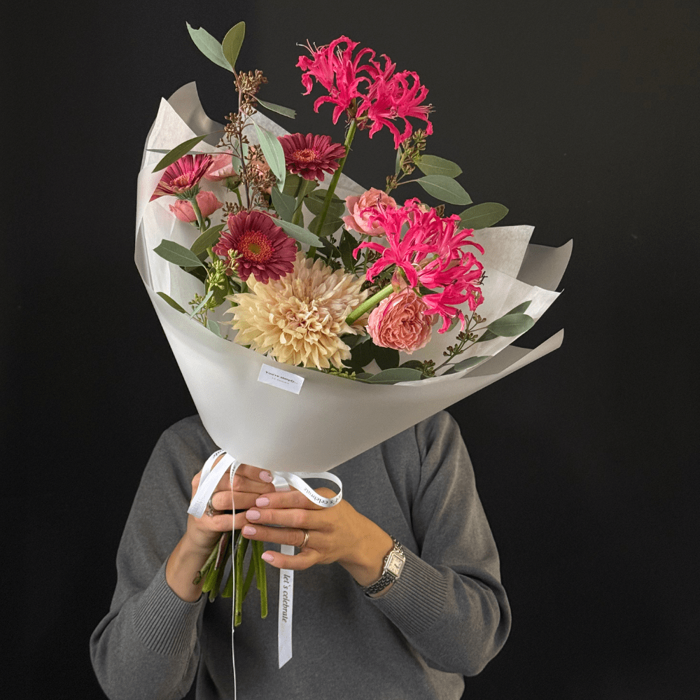 Букет на основе хризантемы, гербер, нерине, кустовой розы и эвкалипта