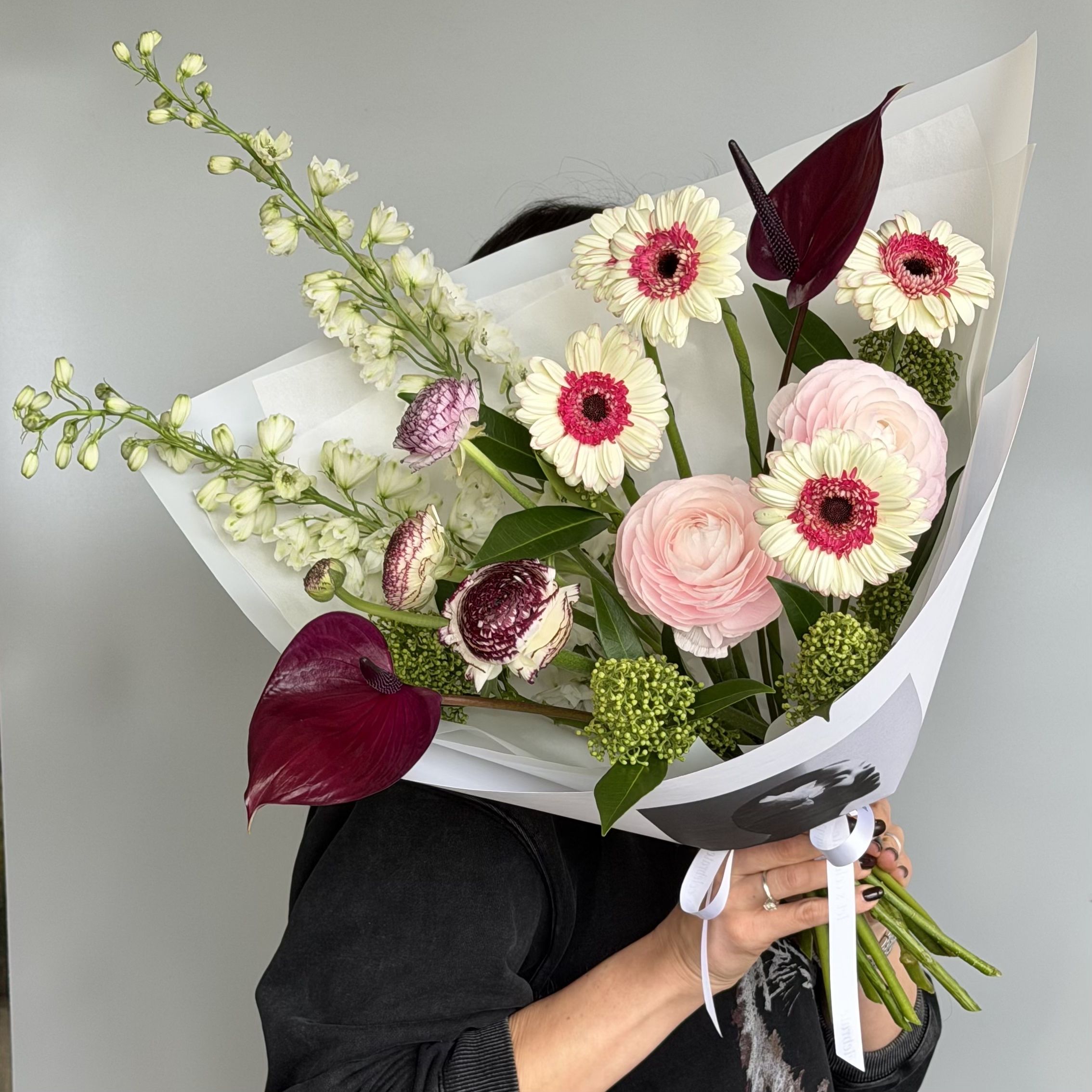 Букет для твоей музы… Роскошь из антуриумов, дельфиниума, ранункулюсов, гербер и скимии.