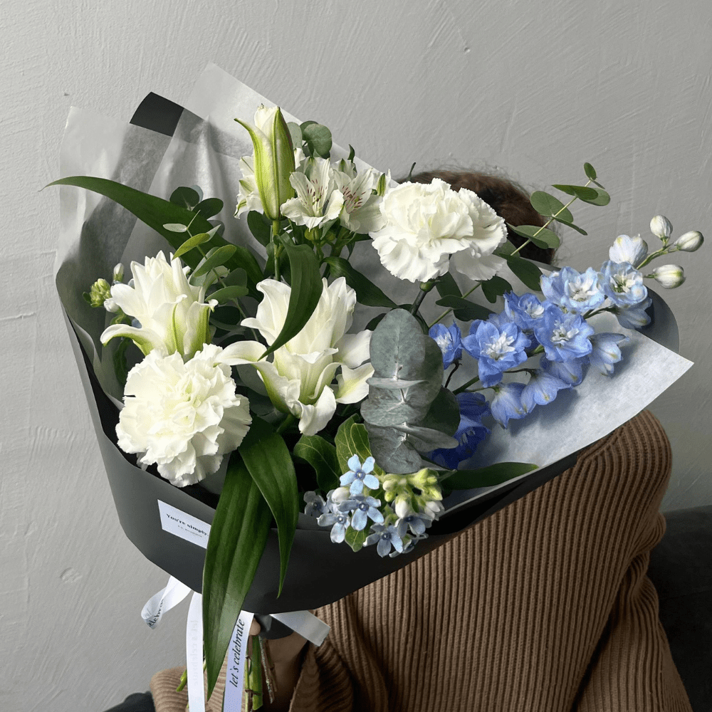 Букет из лилии, гвоздик, твидии, альстромерии, дельфиниума и эвкалипта