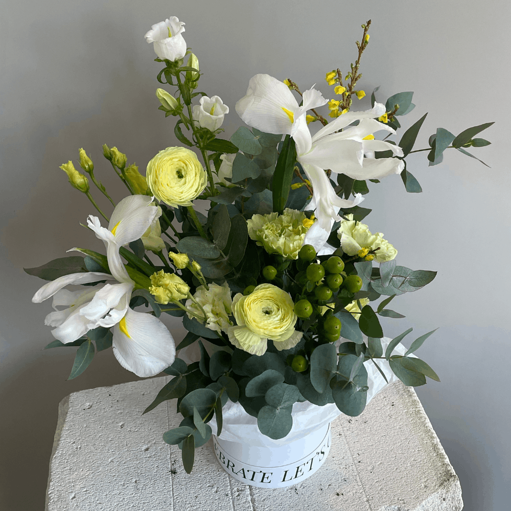 Композиция на основе ранункулюсов, ирисов, гвоздик, эустомы и зелени