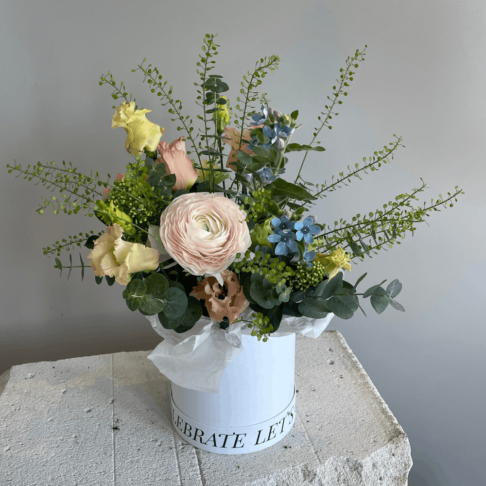 Композиция на основе ранункулюса, эустомы, оксипеталума, тласпи и эвкалипта