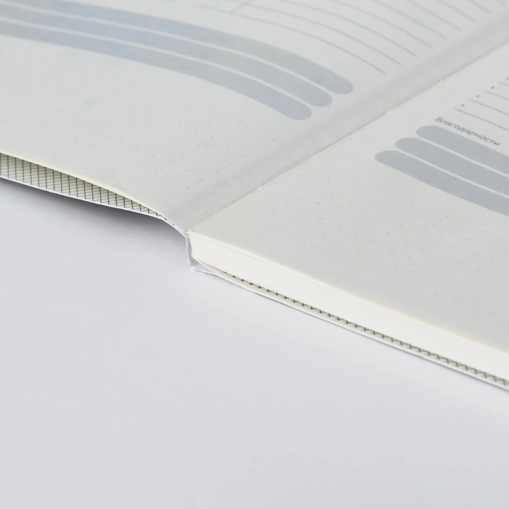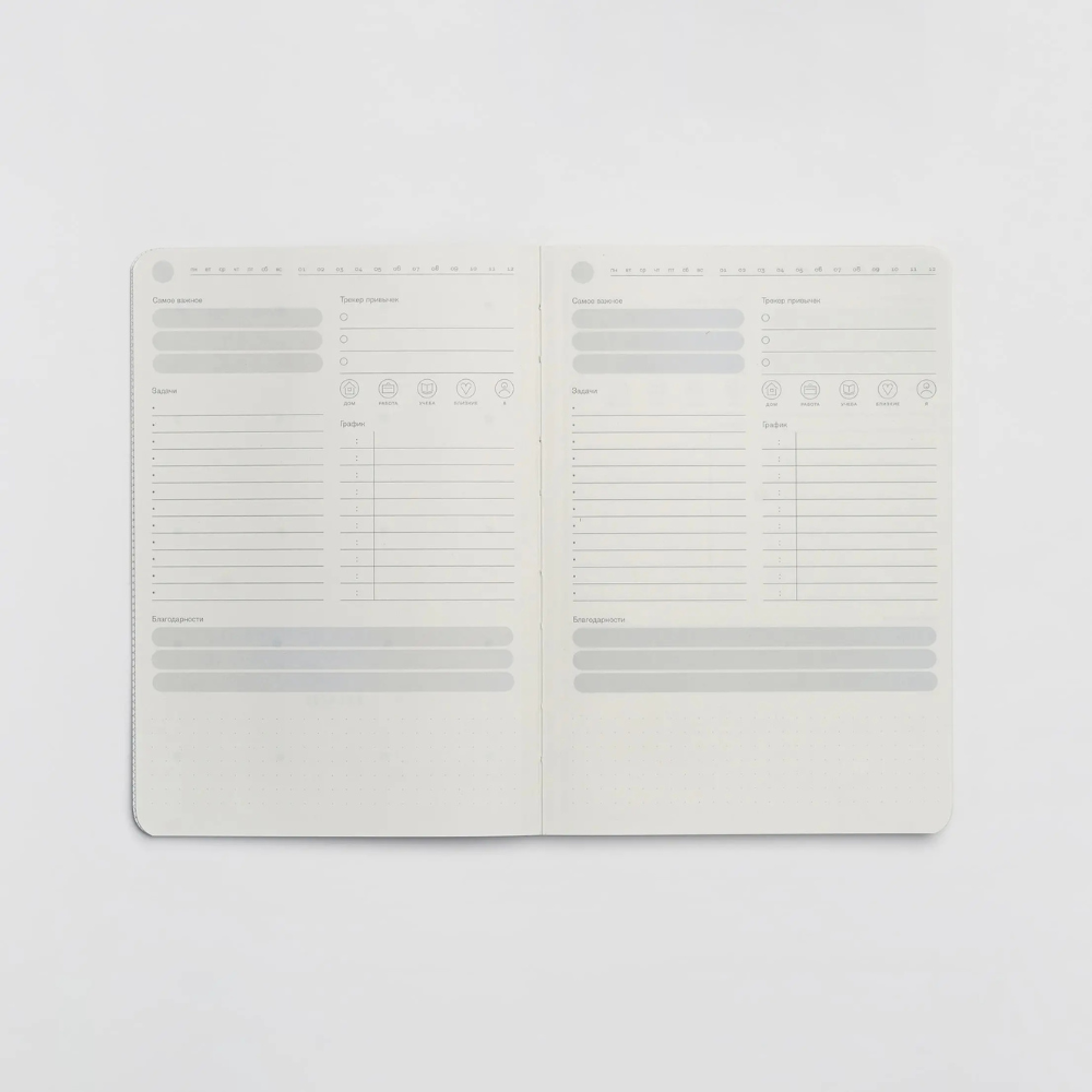 Внутри 110 страничек — хватит на три месяца. В шапке можно отметить дату и день недели.