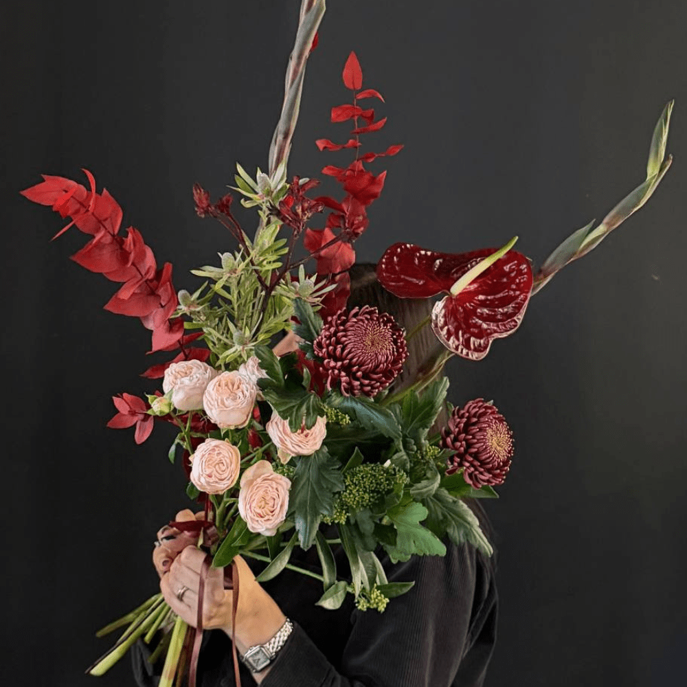 Букет из кустовой розы, хризантемы Бигуди, гладиолусов, леукодендрона, анигозантуса, стабилизированного эвкалипта