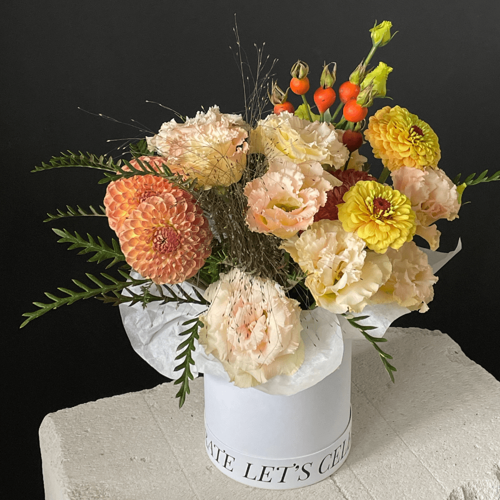Композиция из георгин, цинии, эустомы, ягод шиповника и паникума