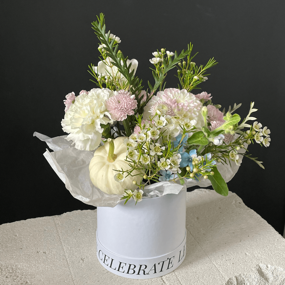 Композиция из георгин, хризантемы, гвоздик, хамелациума, твидии