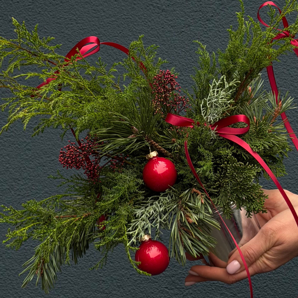 Рождественская композиция из хвойных веточек с шарами и лентами