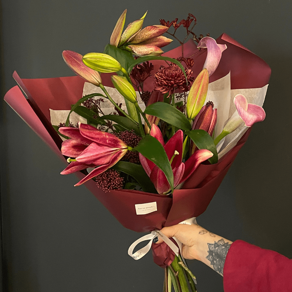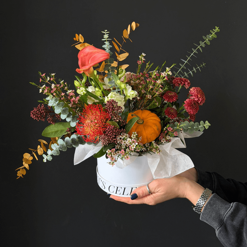 Комозиция из кустовой хризантемы, альстромерии, леукоспермума, каллы, хамелациума, стабилизированного эвкалипта и скимии