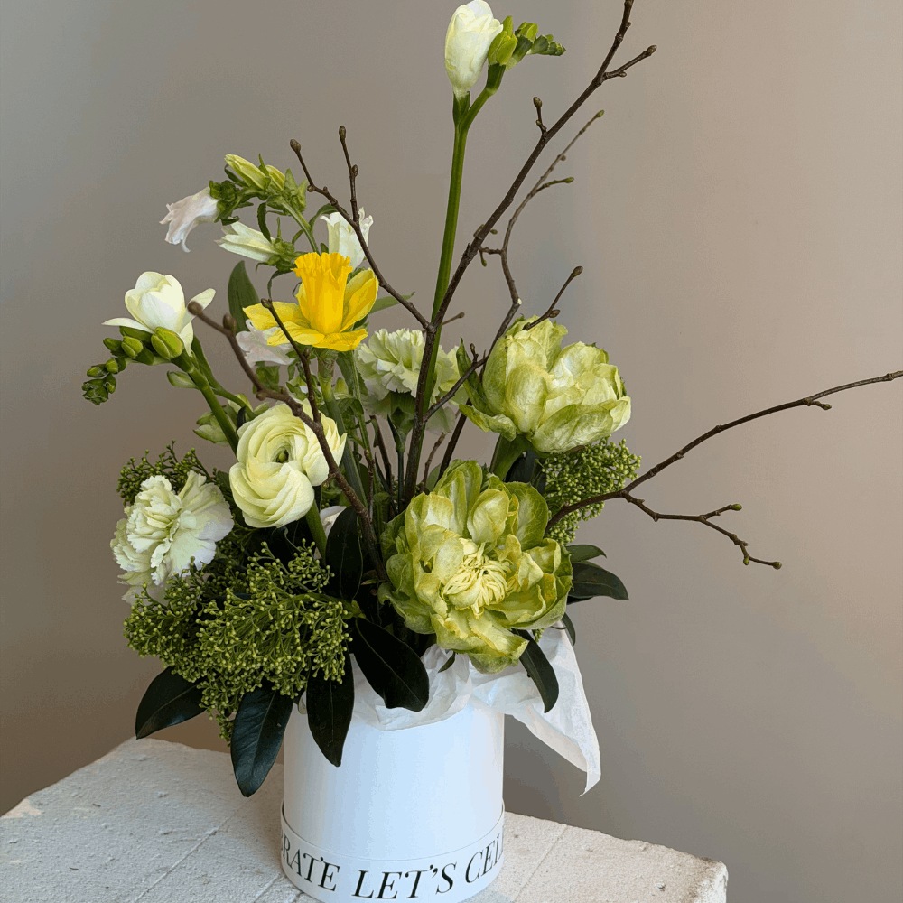 Весенняя композиция из розы Veggie, ранункуюса, скимии, белой фрезии и нарцисса