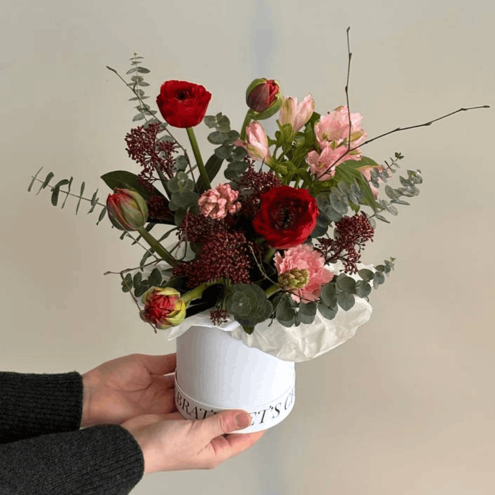 Композиция из тюльпанов, ранункулюсов, альстромерии, гвоздик, скимии и эвкалипта