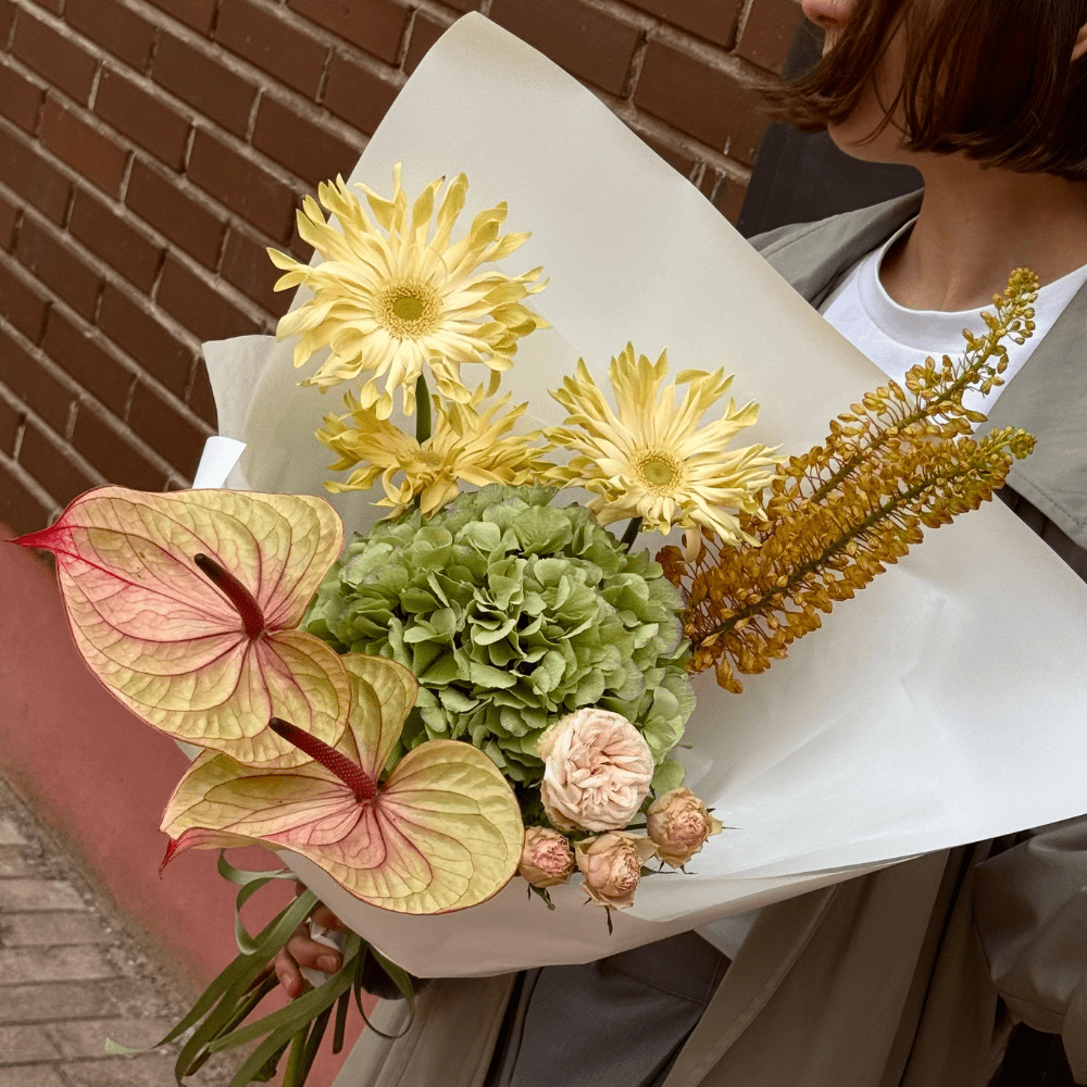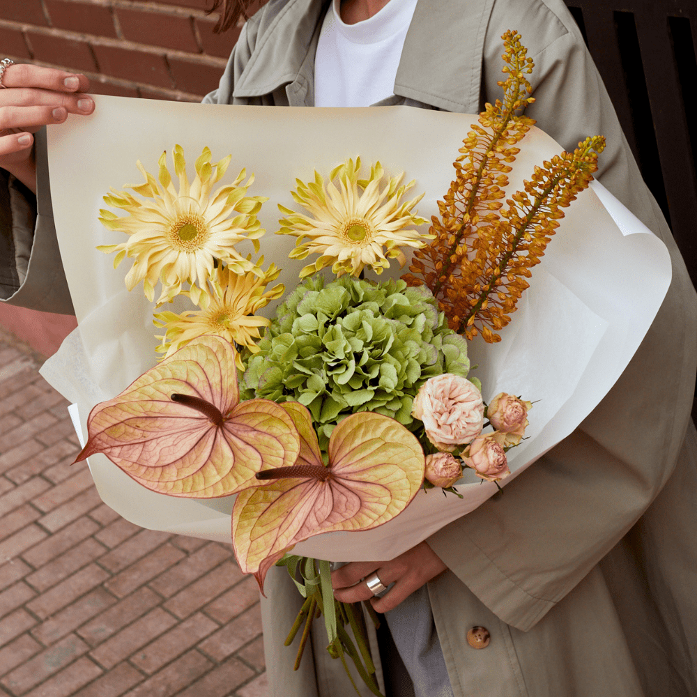 Солнечный и нежный букет из гортензий, эремуруса, антуриума, герберы и розы сорта Джентал.