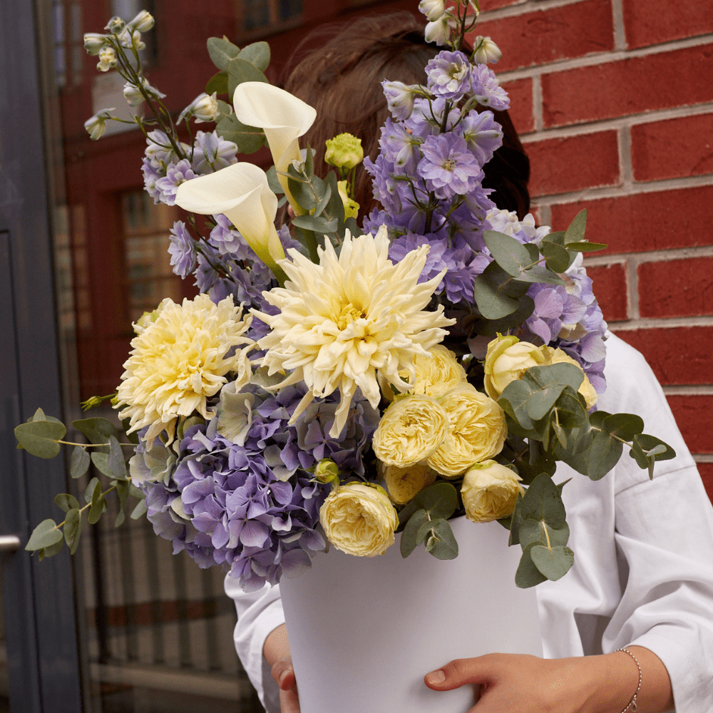 Композиция на основе гортензии, каллы, хризантемы, дельфиниума, розы сорта Айяла, эустомы и эвкалипта