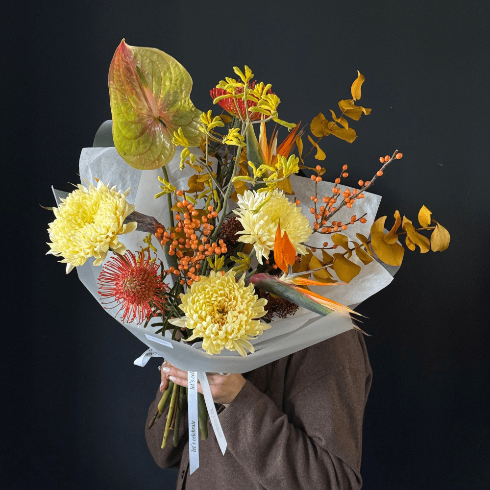 Букет из антуриумов, стрелиции, хризантем, илекса, леукоспермума и стабилизрованного эвкалипта
