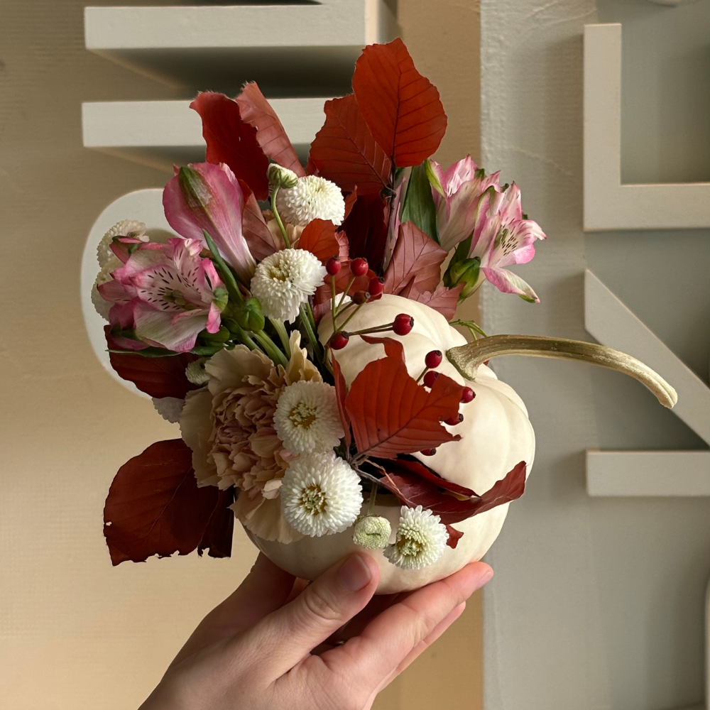 Композиция в тыквочке из альстромерии, хризантемы, гвоздики и дубовых листьев
