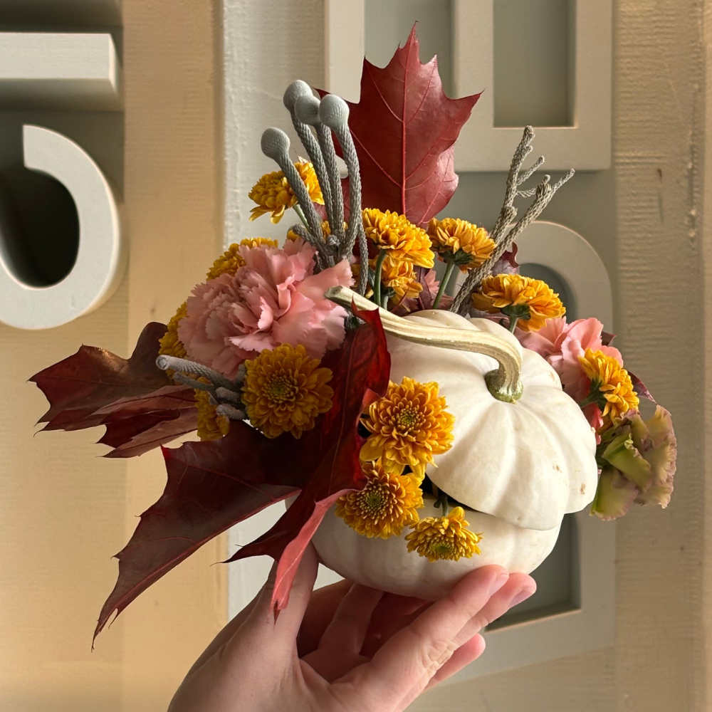 Композиция в тыквочке из хризантемы, гвоздики, брунии и дубовых листьев